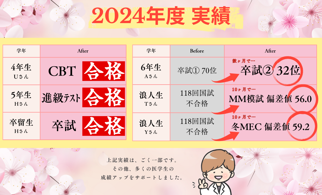 現役臨床医であり、大手医師国家試験予備校講師として100人以上を指導。医学生の悩みを“経験者の視点”で理解し支援を行います。