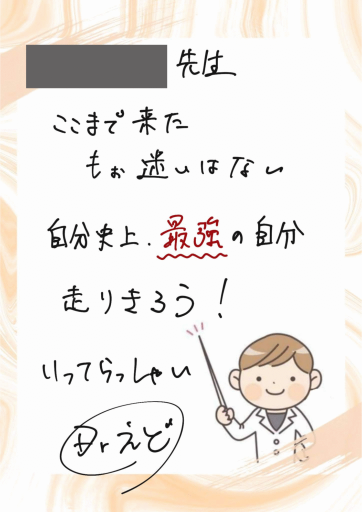 卒業試験と国試の前日に激励電話をいただき当日は思っていたほど緊張せず良い結果につながりました。